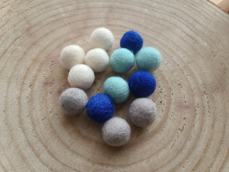 Lot de 40 Boules de laine feutrées bleues ciel, bleues marine, blanches, grises pour vos thèmes d'hiver.
