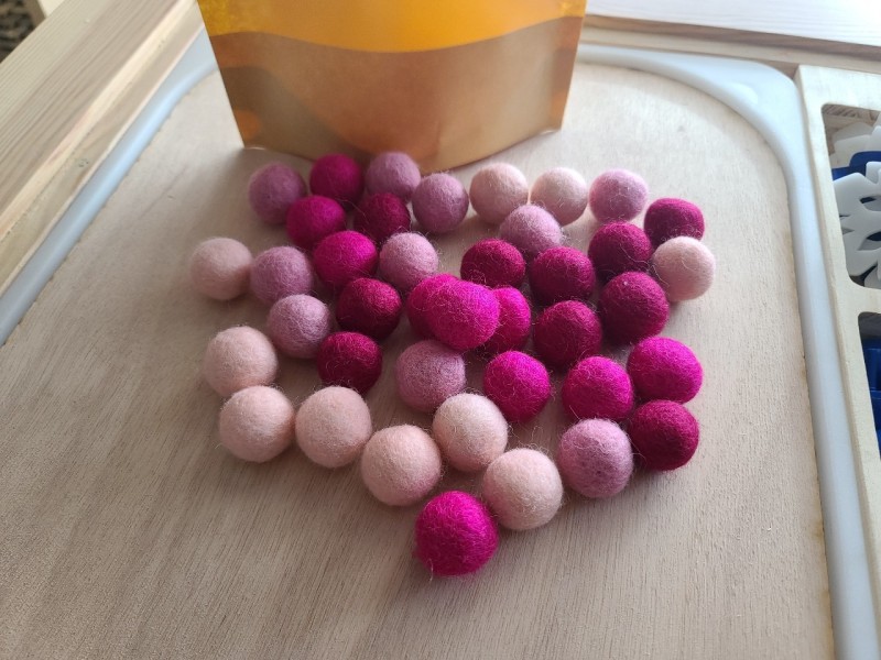 Lot de 40 Boules de laine feutrées roses, roses pales, fushia, bordeaux pour vos thèmes de saint Valentin.