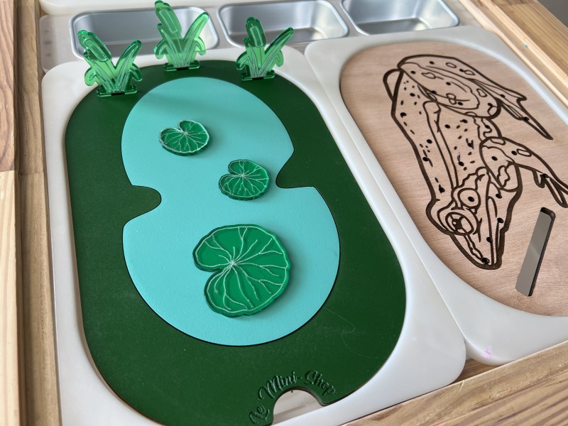 Insert petit bac la mare en couleur et ses accessoires en pmma : 3 nénuphars, 3 quenouilles.