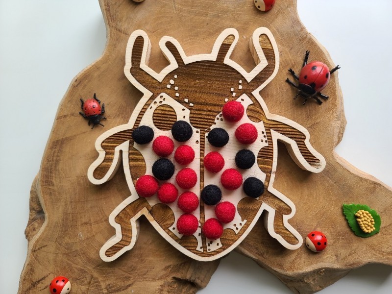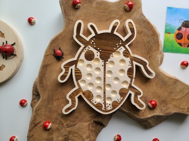 Coccinelle en bois pour activités de motricité fine et de comptage.