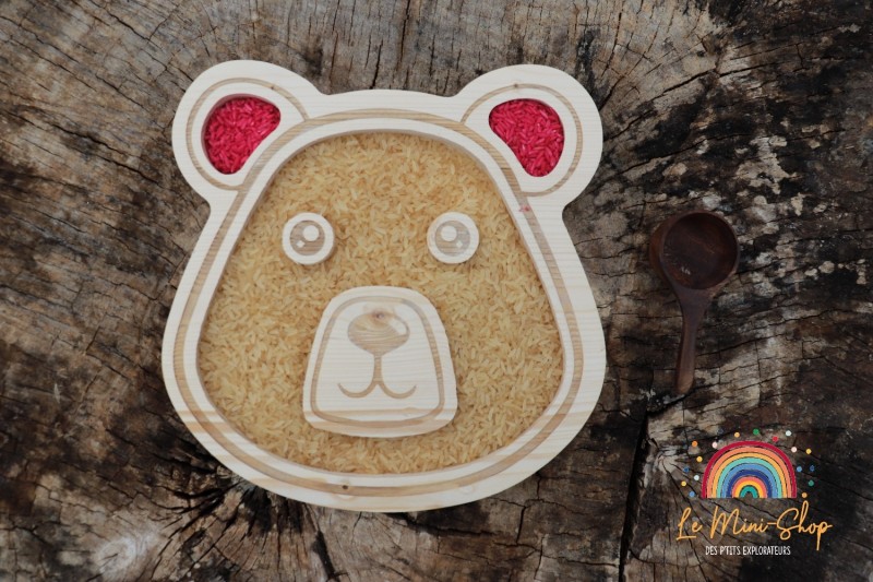 Support en bois creusé pour des activités de transvasement de riz, semoules ou graines avec des pelles, avec les doigts ou des pinces....