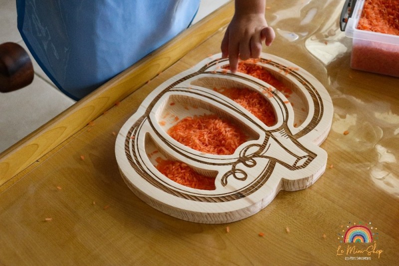 Support en bois creusé pour des activités de transvasement de riz, semoules ou graines avec des pelles, avec les doigts ou des pinces....