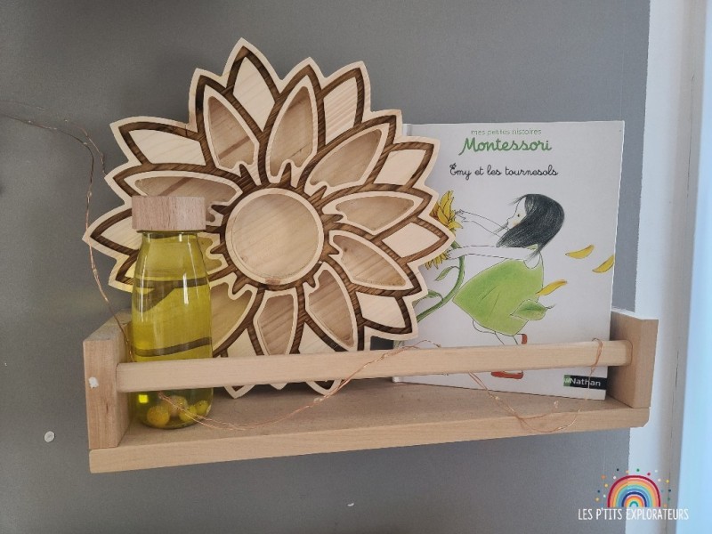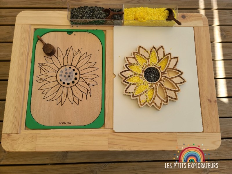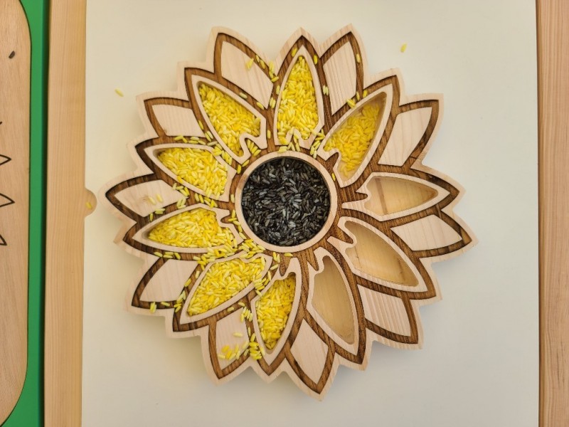 Tournesol à remplir en bois pour des activités de transvasement de riz, semoules ou graines avec des pelles, avec les doigts ou des pinces... pour des activités de transvasement de riz, semoules ou graines avec des pelles, avec les doigts ou des pinces....