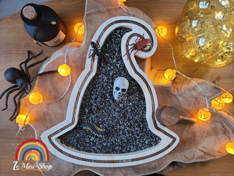 Chapeau de sorcière à remplir en bois pour des activités de transvasement de riz, semoules ou graines avec des pelles, avec les doigts ou des pinces... pour des activités de transvasement de riz, semoules ou graines avec des pelles, avec les doigts ou des pinces....